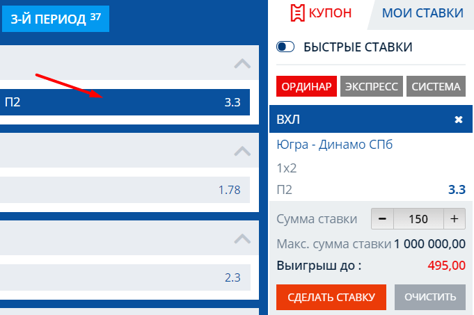 На странице росписи кликните по исходу. К примеру, выигрыш гостей – П2.