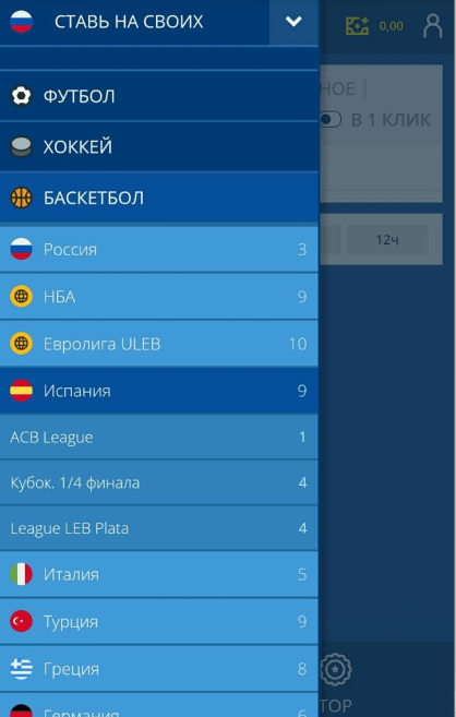Кликните в левом верхнем углу по значку списка (три полосы), дабы посмотреть доступные виды спорта. Выберите дисциплину, предположим, баскетбол, а затем – страну и лигу.