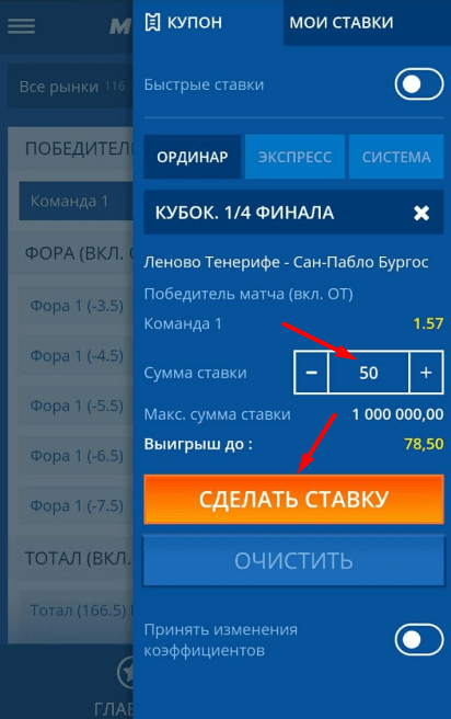 Активируйте в купоне ползунок возле «Быстрые ставки» и укажите сумму пари. Теперь при клике по исходу, сделка будет оформляться автоматически.