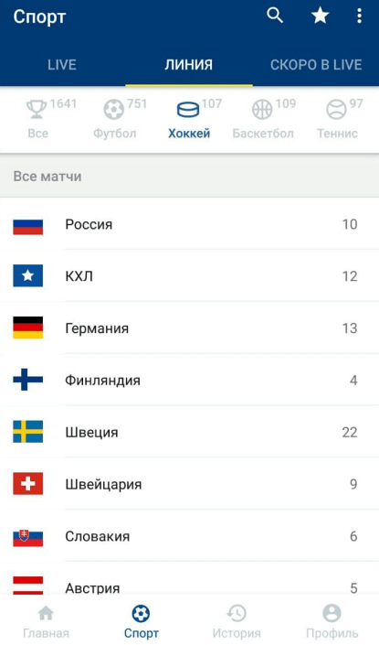 Букмекер принимает ставки на основные виды спорта в режиме прематч и лайв – до начала матча и по ходу поединка. События распределены по дисциплинам и чемпионатам. Поддерживается поиск по ключевому слову.