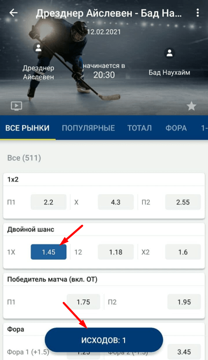 На странице росписи кликните по исходу. Например, двойной шанс 1Х.