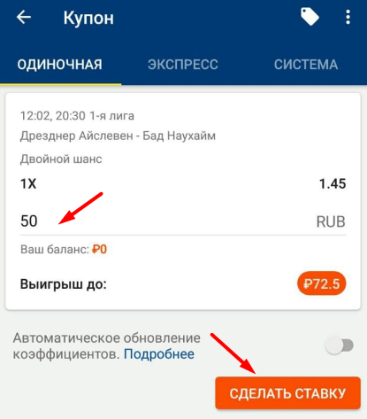 Данные отобразятся в купоне с правой стороны. Впишите сумму и нажмите «Сделать ставку».